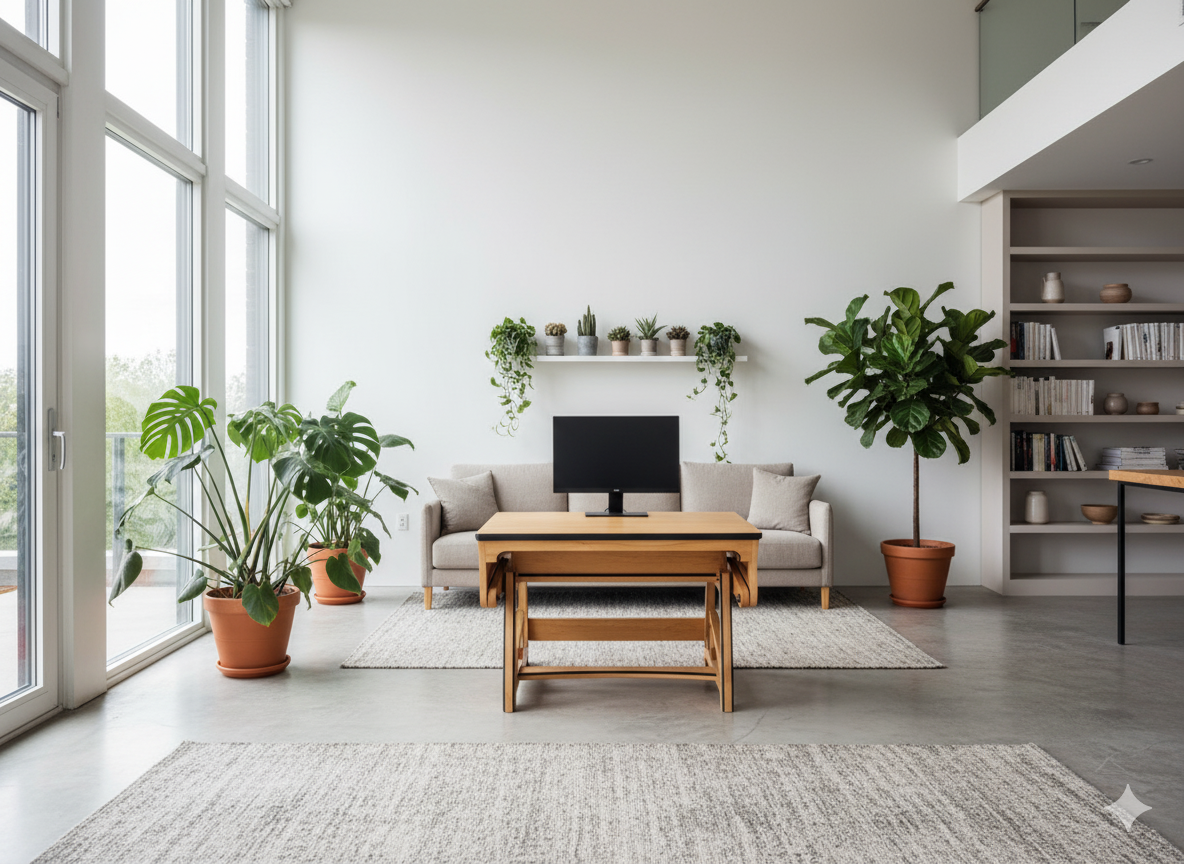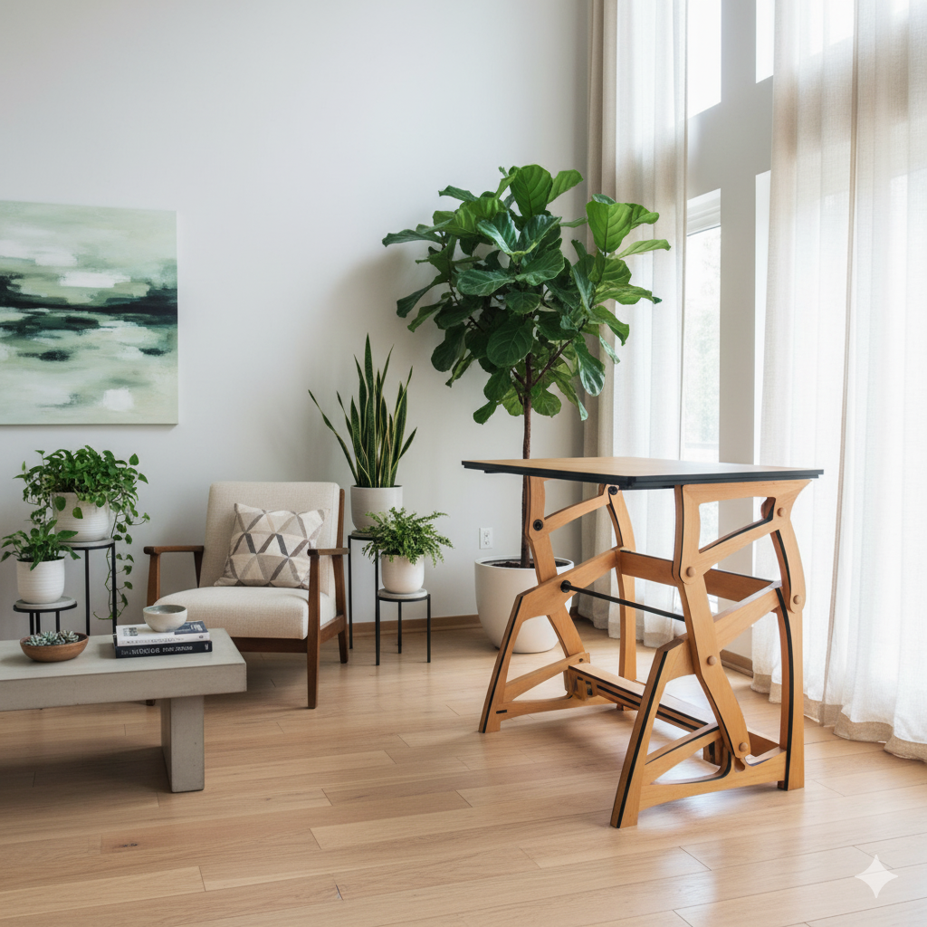 Ce meuble est un bureau ergonomique dit « assis-debout » permettant de répondre à une problématique actuelle liée à l’utilisation prolongée d’un ordinateur en position assise. En alternant entre les positions tout au long de la journée de travail, la posture est améliorée en renforçant les muscles du dos et du cou et ainsi réduire les douleurs chroniques associées à une position assise prolongée. De plus, un bureau assis-debout peut avoir un impact positif sur la santé mentale. Des études ont montré que le fait de rester assis pendant de longues périodes peut entraîner une fatigue mentale et une diminution de la productivité.