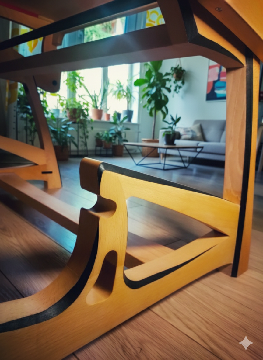 Structure en hêtre massif avec chanfrein progressif noir et plateau en placage de chêne