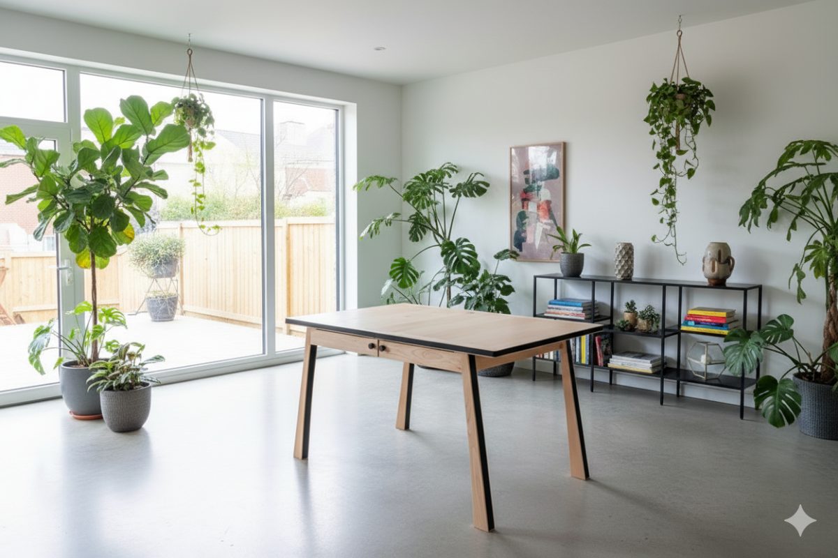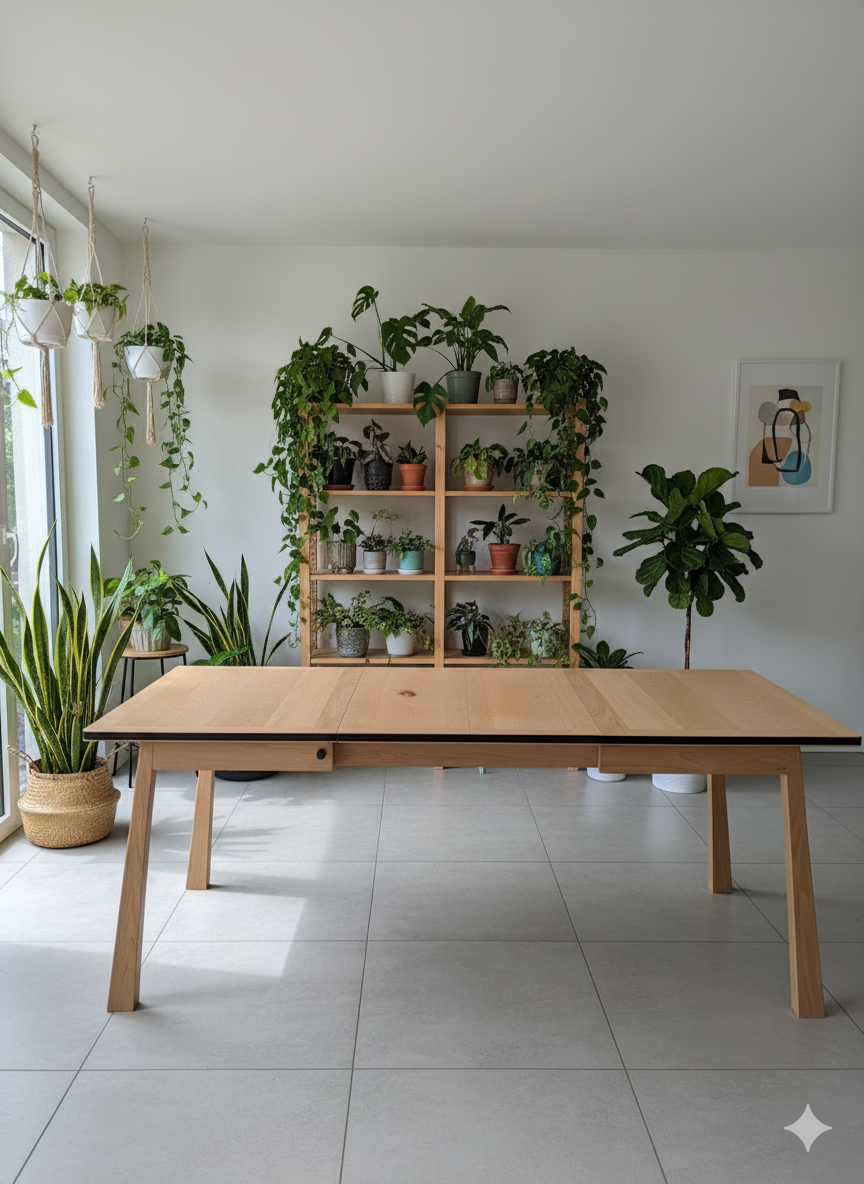 Cette table à manger extensible allie simplicité, fonctionnalité et élégance dans un design épuré. Entièrement réalisée en bois massif, elle met en valeur la chaleur naturelle du matériau tout en offrant une solidité à toute épreuve. Ses lignes franches et ses proportions équilibrées en font une pièce conviviale, pensée pour s’intégrer harmonieusement dans tout type d’intérieur, du plus contemporain au plus traditionnel. Son plateau modulable permet d’agrandir la surface en un geste, offrant ainsi un confort d’usage idéal pour les repas en famille ou entre amis. Le soin apporté aux assemblages et aux finitions reflète un véritable travail artisanal, où chaque détail compte : visserie discrète, arêtes adoucies et contraste subtil entre bois clair et touches sombres. À la fois pratique et esthétique, cette table incarne une approche du mobilier centrée sur la durabilité, la qualité des matériaux et le plaisir d’un design sobre, fonctionnel et intemporel.