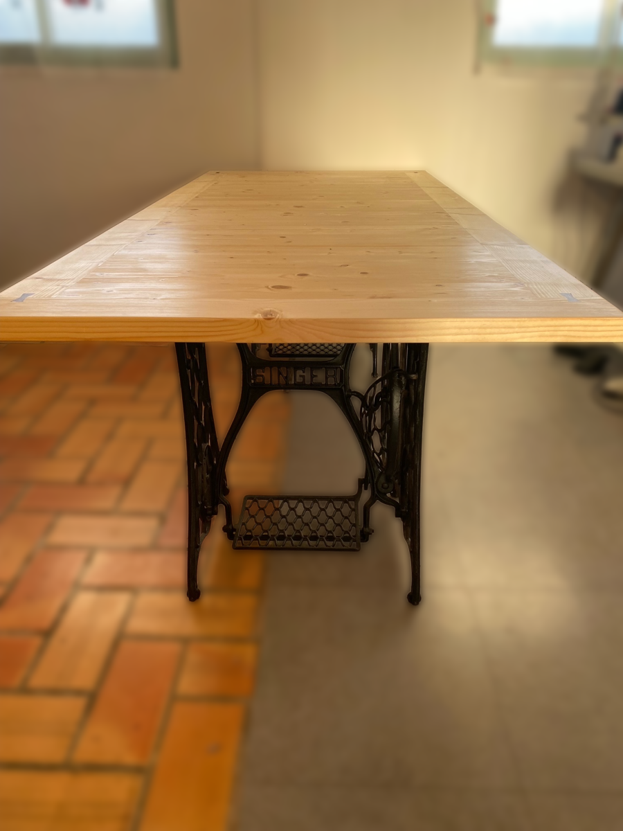 Le plateau en bois massif a été soigneusement fabriqué pour offrir une surface lisse et spacieuse. Sa texture naturelle et chaleureuse apporte une dimension authentique, tout en étant assez robuste pour supporter des années de projets créatifs. Avec ses finitions impeccables, ce plateau est non seulement pratique mais aussi une pièce élégante qui s’intègre parfaitement dans un atelier de couture ou un espace de vie. Les pieds de la table, quant à eux, proviennent d’anciennes machines à coudre Singer. Ces bases en fonte, empreintes d’histoire, ont été nettoyées et préservées pour conserver leur éclat d’origine. Elles apportent une stabilité optimale tout en ajoutant une touche de charme vintage. Les pédales d’origine, qui rappellent l’époque où ces machines étaient actionnées à la main, deviennent ici un élément décoratif qui raconte une histoire. Cette table ne se contente pas d’être un meuble fonctionnel : elle transforme un espace de travail en un lieu inspirant, où chaque couture devient une expérience créative.